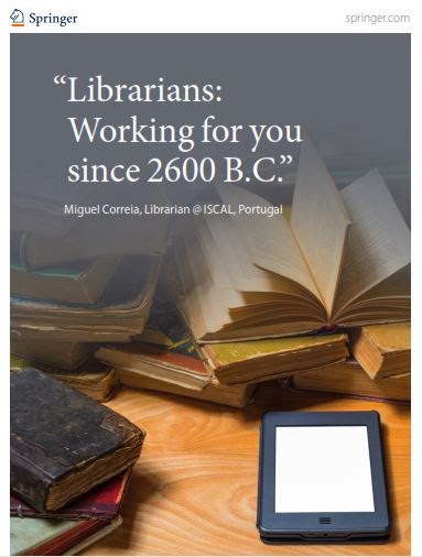 Sinds 2600 voor Christus. Papierrollen, vergeelde pagina’s en allerlei boeken. Wat moet je zonder een bibliothecaris. Die leidt je rond in de verhalen en kennis van toen en nu. Om van te leren, om van te ontwikkelen en om te groeien. Springer benadrukt dit met een foto van een e-reader en oude boeken. Ga gewoon met de tijd mee.