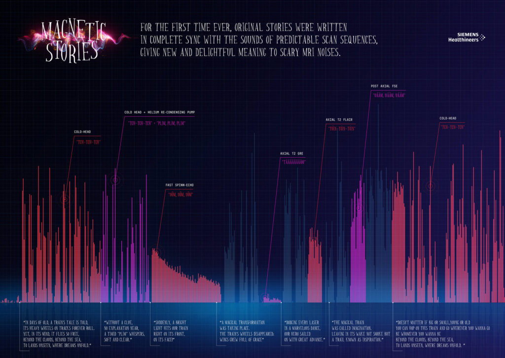 Het lawaai van een MRI heeft impact. Lawaai omzetten in geluid, in een verhaal is een betere oplossing. Siemens bedacht Magnetic Stories hiervoor. Wel de MRI, niet het lawaai, wel een verhaal.