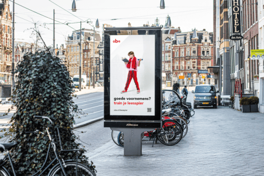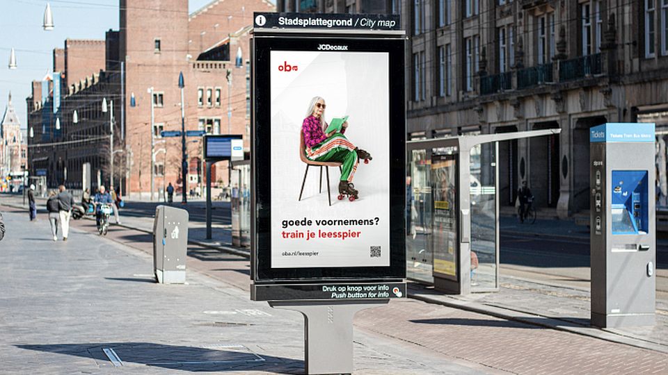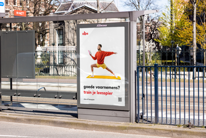Een goed voornemen in januari is je leesspier trainen. Dat is de campagne van de OBA in 2024. Voor de campagne werden mensen met iets uit de sportschool gefotografeerd. Natuurlijk is een boek toegevoegd. Ga meer lezen, train je leesspier.