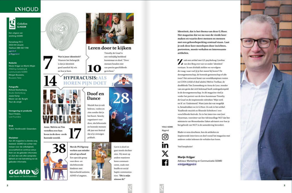 Voor GGMD maakte ik het magazine. Naast het voorwoord staat een foto van mij met mijn naamgebaar. (hier te vinden: publicatiesggmd.nl) (2022)