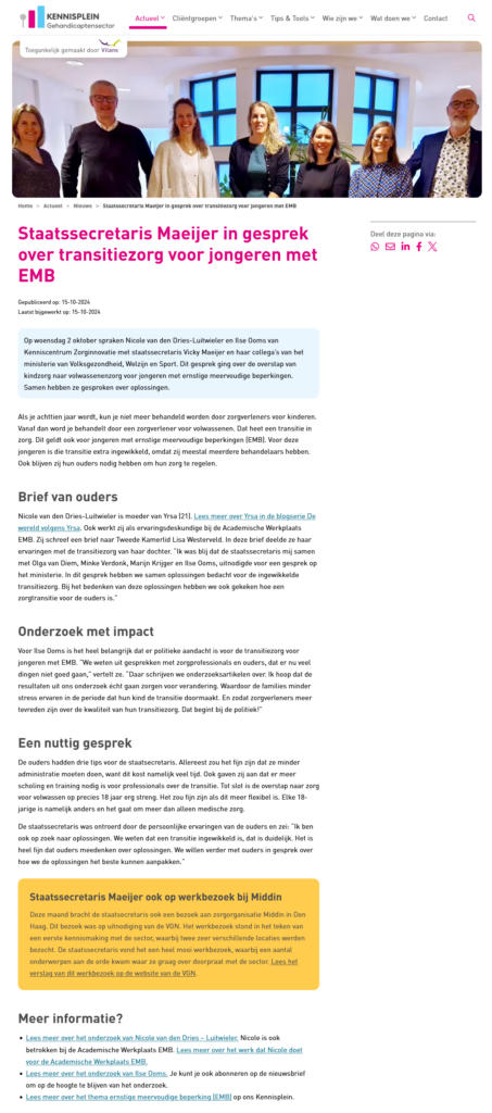 Op bezoek bij de staatsecretaris. Een artikel staat op Kennisplein Gehandicaptensector. oktober 2024